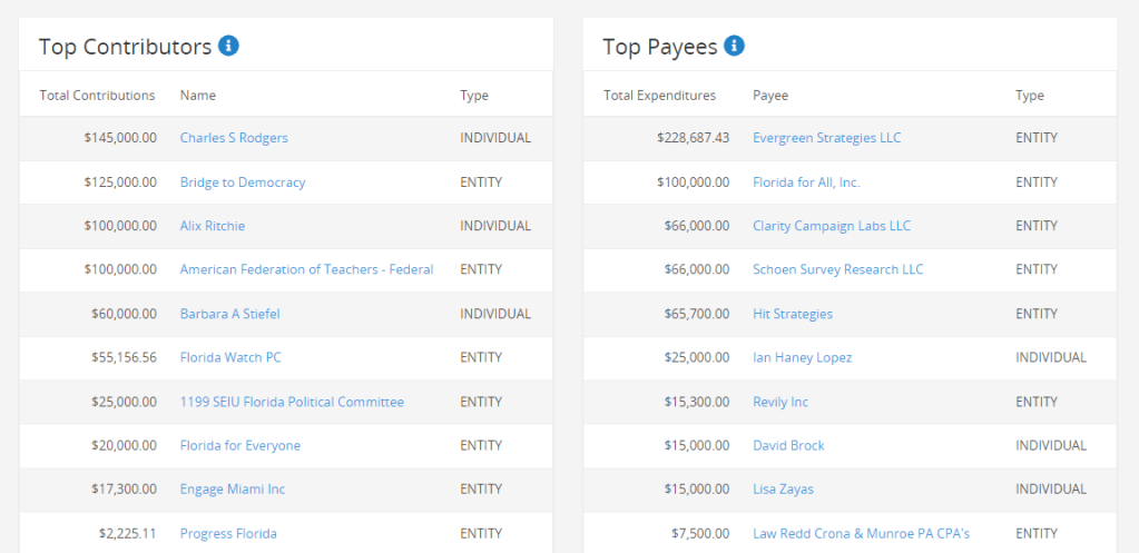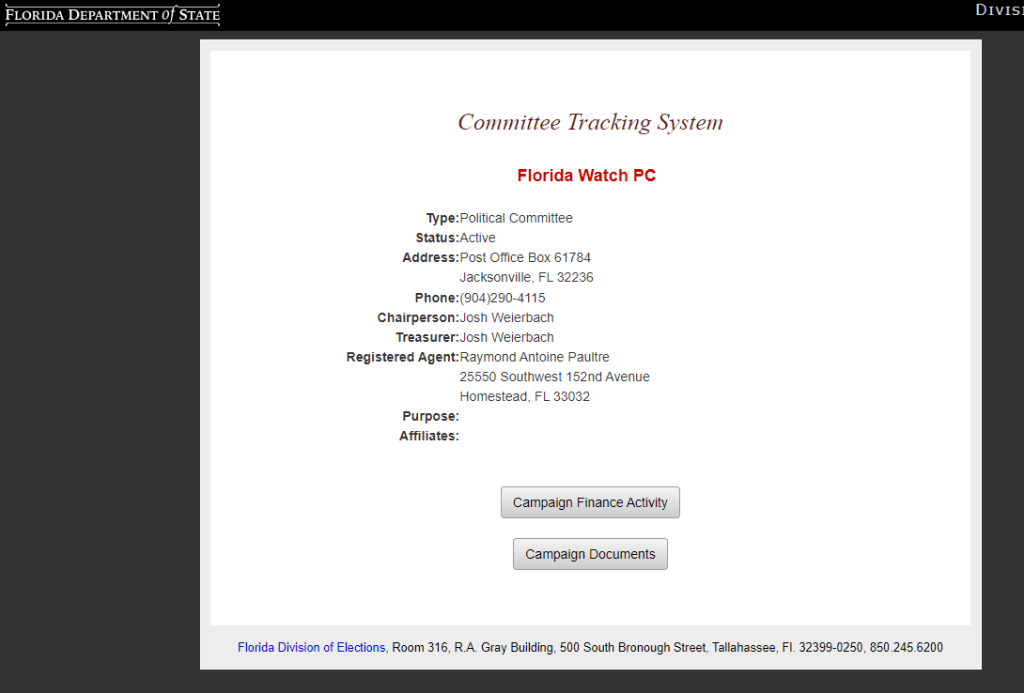 They’ve been around since 2020, raising about $3.2 million dollars and spending about the same. But their registered agent is in Homestead, a Dade County (Miami) city. The former agent was in Tallahassee. Are they really a local PAC? Their address is a PO Box, which is fishy.