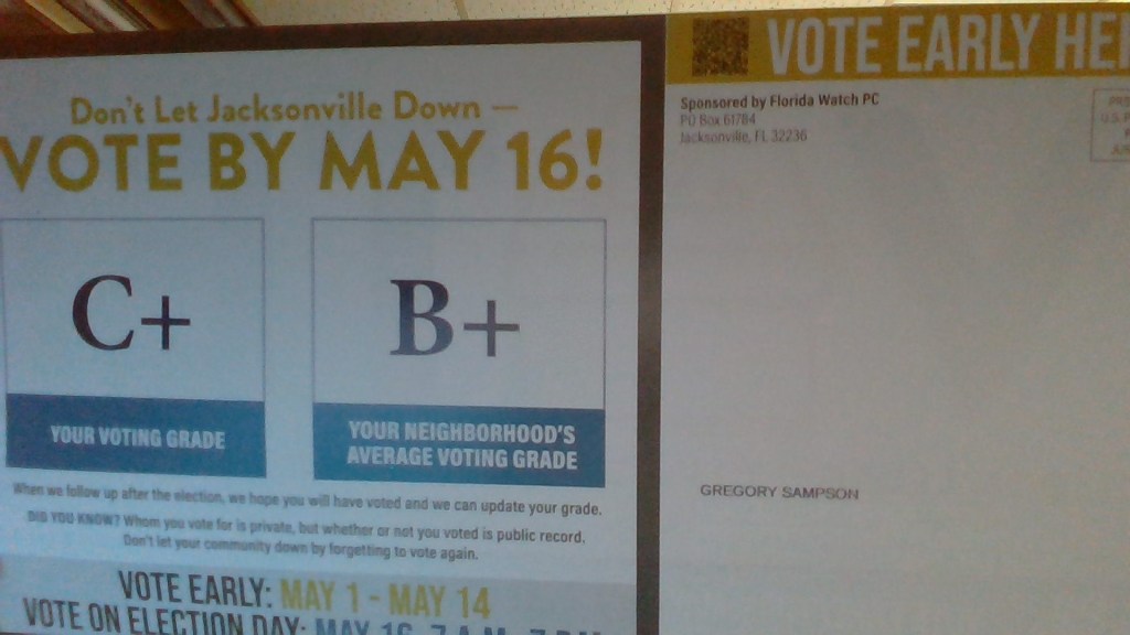 Off-year elections are notorious for low voter participation. In the Jacksonville mayor’s race, Democrat Donna Deegan is outpolling Republican Daniel Davis. However, the only poll that matters is the one that takes place at the precincts when voters cast ballots. To win, Deegan has to get voters to the precincts and it would seem that the mailer is an attempt to aid that process, which is not to say that there is any connection between Florida Watch and the Deegan campaign.